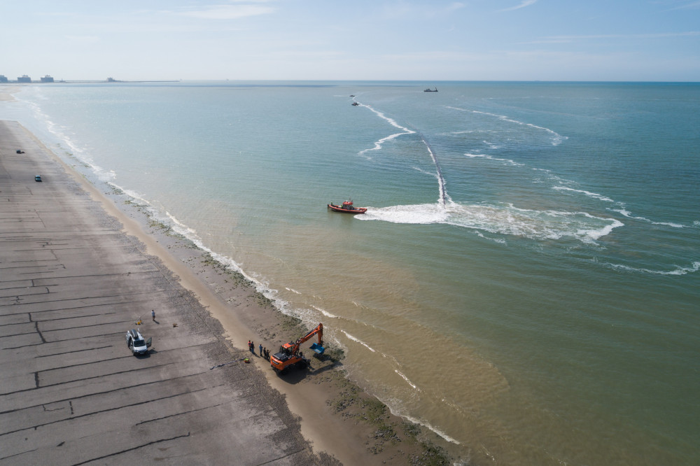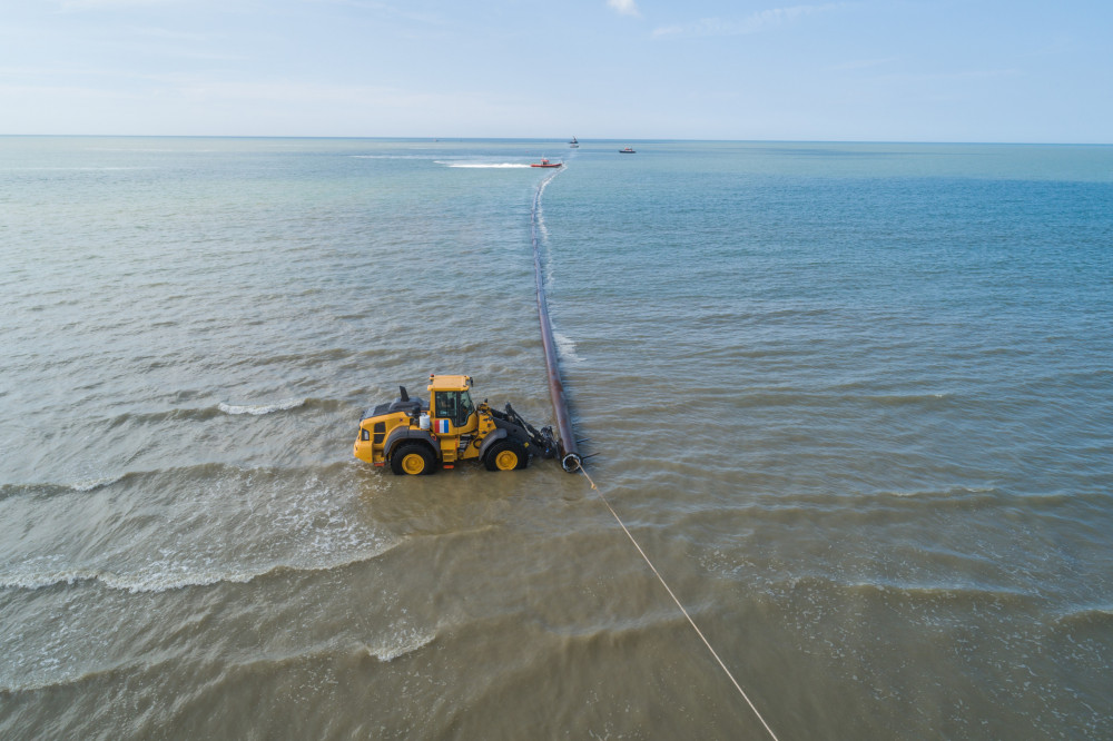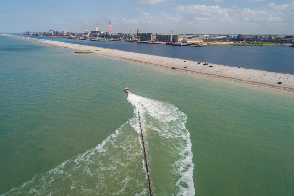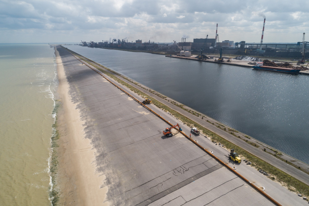 De pijpstukken zijn op de dijk nabij de afzinklocatie aan elkaar gelast en vervolgens als één geheel al drijvend naar de afzinklocatie getransporteerd en afgezonken.
